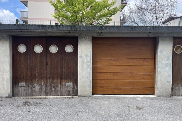 Nous avons proposé à notre client de remplacer sa porte de garage manuelle en bois par une porte sectionnelle motorisée HÖRMANN Rénomatic.